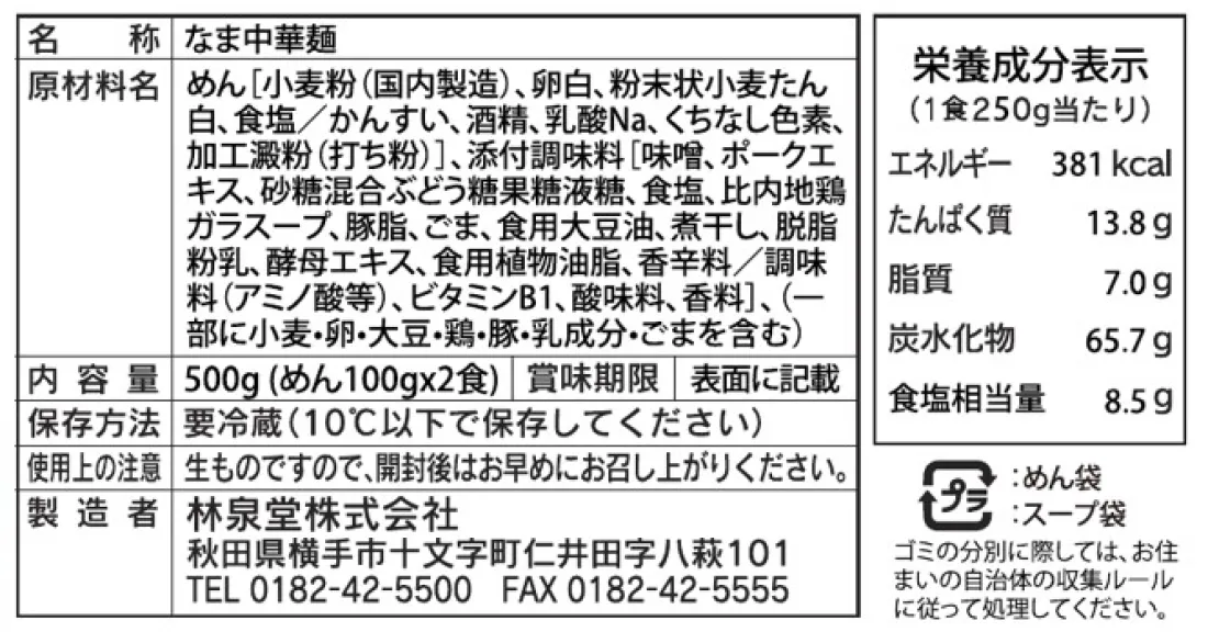 | アレルギー表示 | 小麦・卵・大豆・鶏肉・豚肉・乳成分・ごま 本品製造工場では、「そば」、「卵」、「乳」、「やまいも」、「ごま」を含む製品を生産しております |