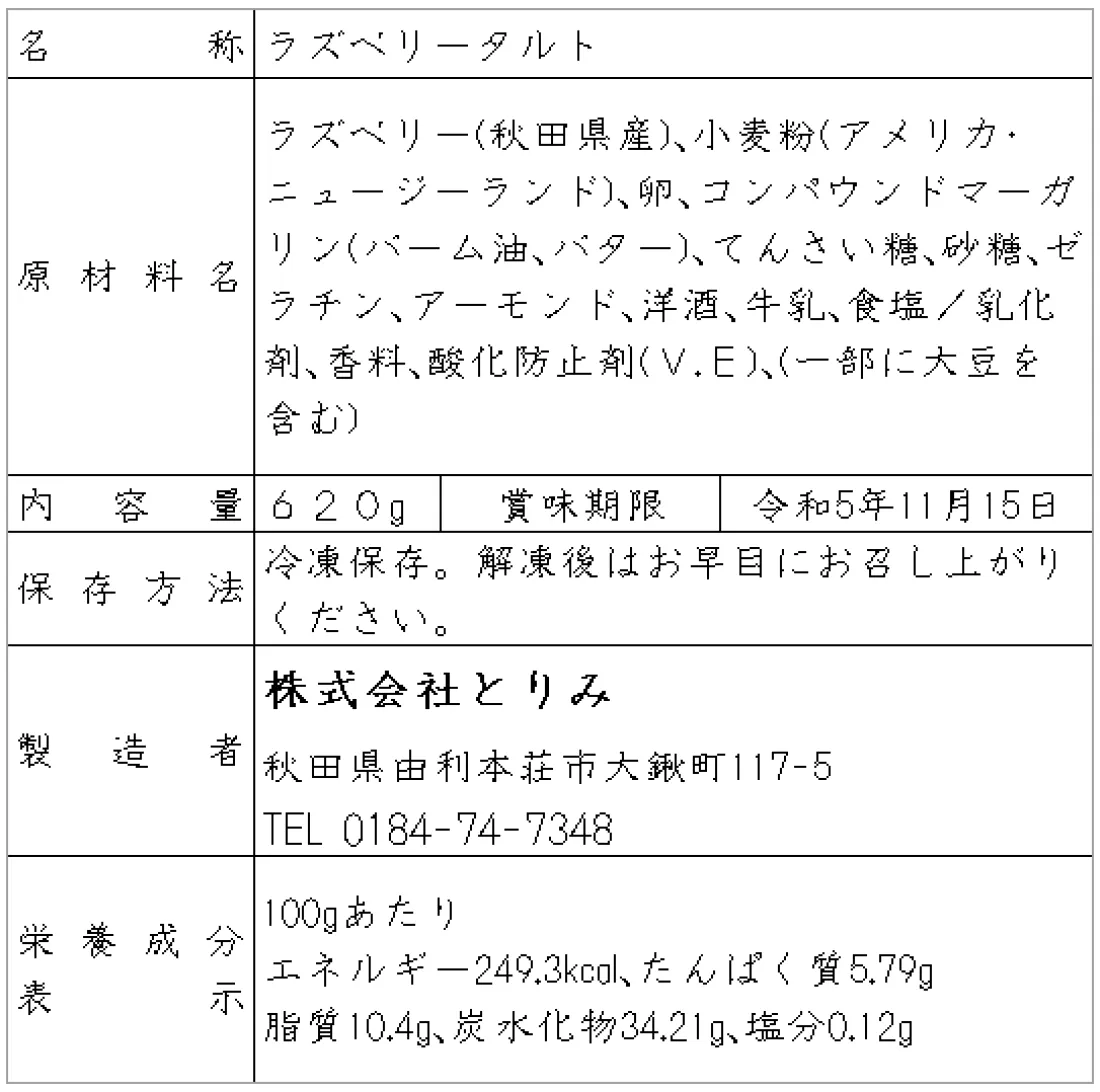 さくさくのクッキー生地の上にとりみ農園特製ラズベリージャムをぬり、その上に隙間なく秋田県産ラズベリーを敷き詰めた贅沢なタルトです。甘酸っぱいラズベリーと国産ならではの香りをお楽しみください。添加物不使