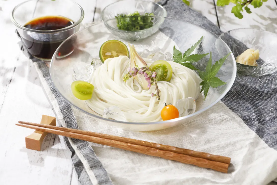 『手綯(てない)製法』で作る稲庭うどん。殆どの工程が手作業で、発祥当時の作り方を今も尚守り続けています。滑らかな喉越しとコシが特徴です。当社では職人たちが一本一本丁寧に、精魂込めて作り上げております。